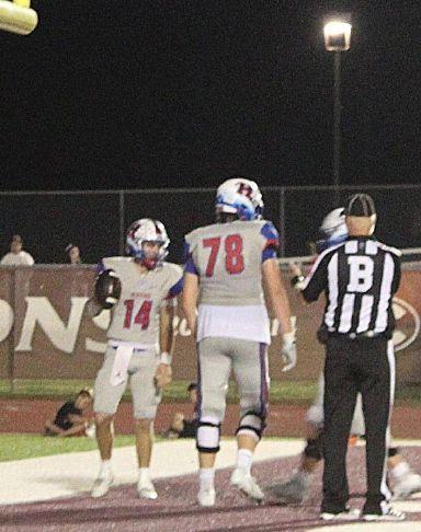 Heritage quarterback Dax Montelongo (14) gets in the end zone for one of his five rushing touchdowns, and seven TDs total on the night, in last Friday's 56-21 victory at Ennis. Photo Credit: Patty Hullett / Mirror contributor