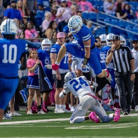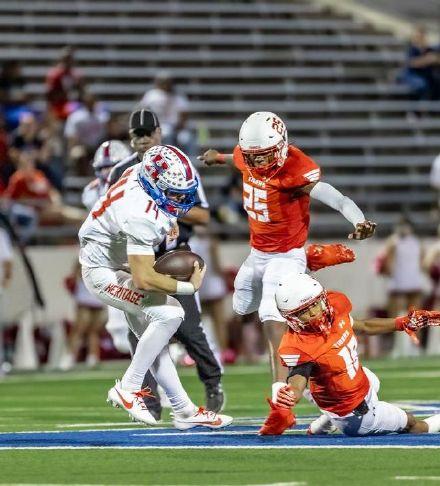 Heritage senior quarterback Dax Montelongo (14) gets caught in traffic with an official and two Terrell defenders during Thursday night's District 6-5A (II) game. The Tigers beat the Jaguars, 21-14. Photo Credit: Chris Pauley / Mirror contributor